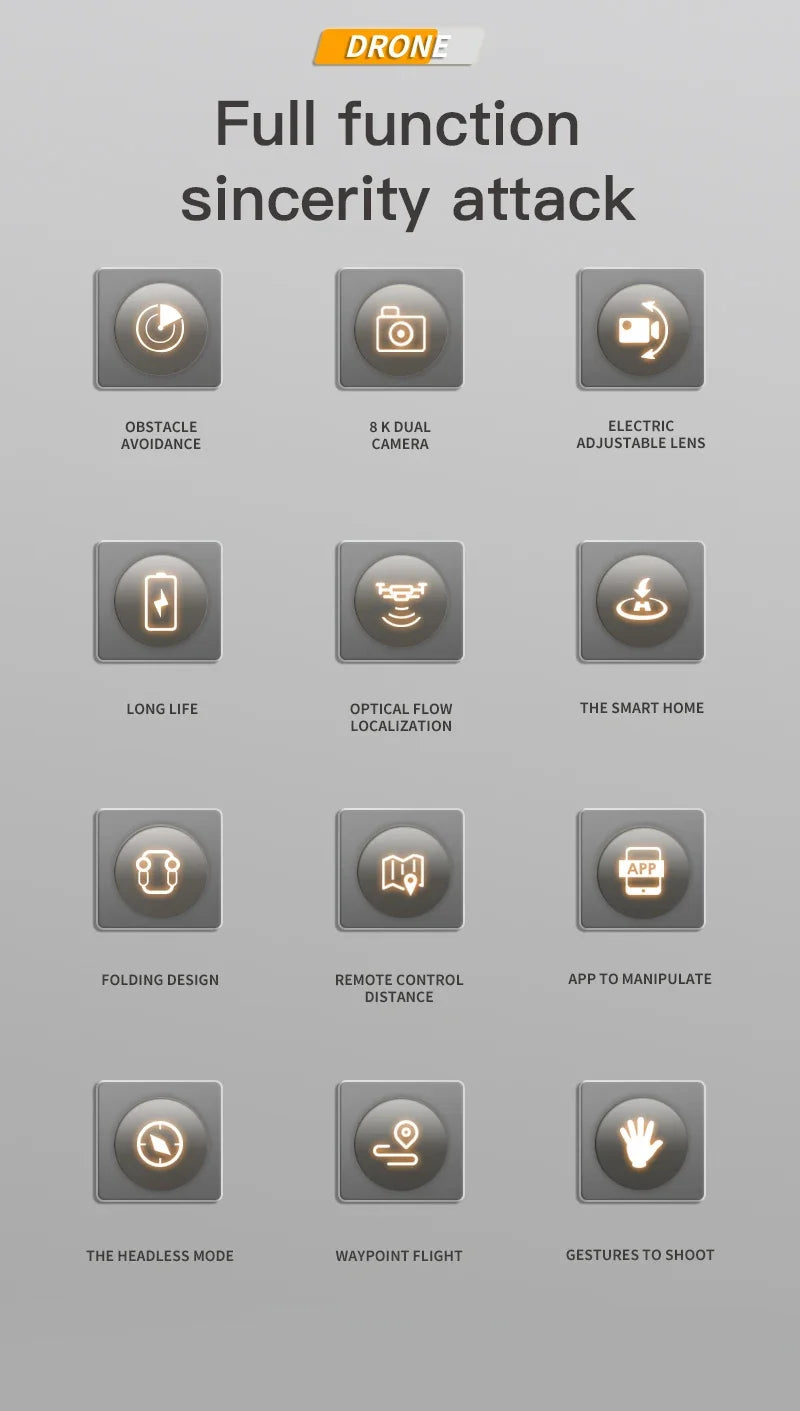6. Gesture photography, optical flow positioning, brushless motor, super long battery life, obstacle avoidance gimbal components, stop without collision when encountering obstacles
