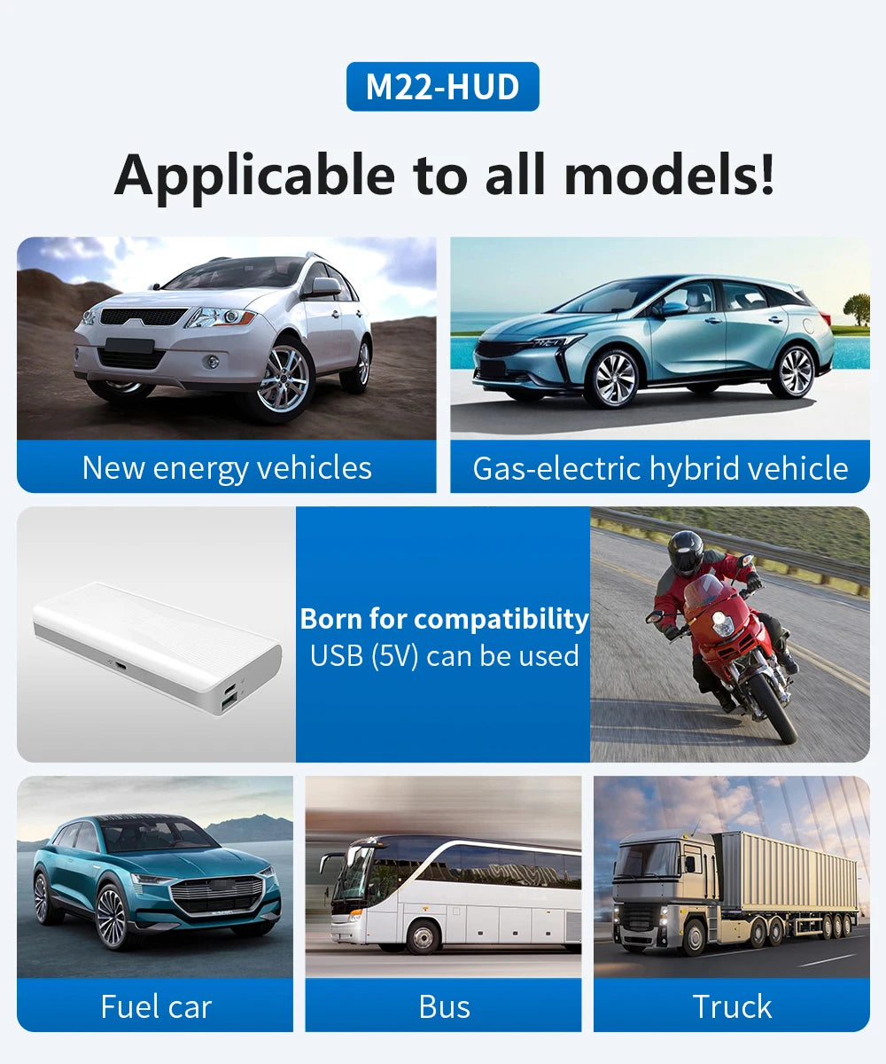 The car GPS HUD automatically adjusts its brightness based on surrounding conditions, ensuring optimal visibility in both low-light and bright environments. It offers various interface options for displaying different data such as vehicle speed, compass, travel time, distance traveled, and time. The smart head-up display can be powered via the vehicle's USB (5V) port or by using a cigarette lighter adapter. It is compatible with all vehicles equipped with a USB interface, including cars, electric vehicles, trucks, hybrid vehicles, and more.