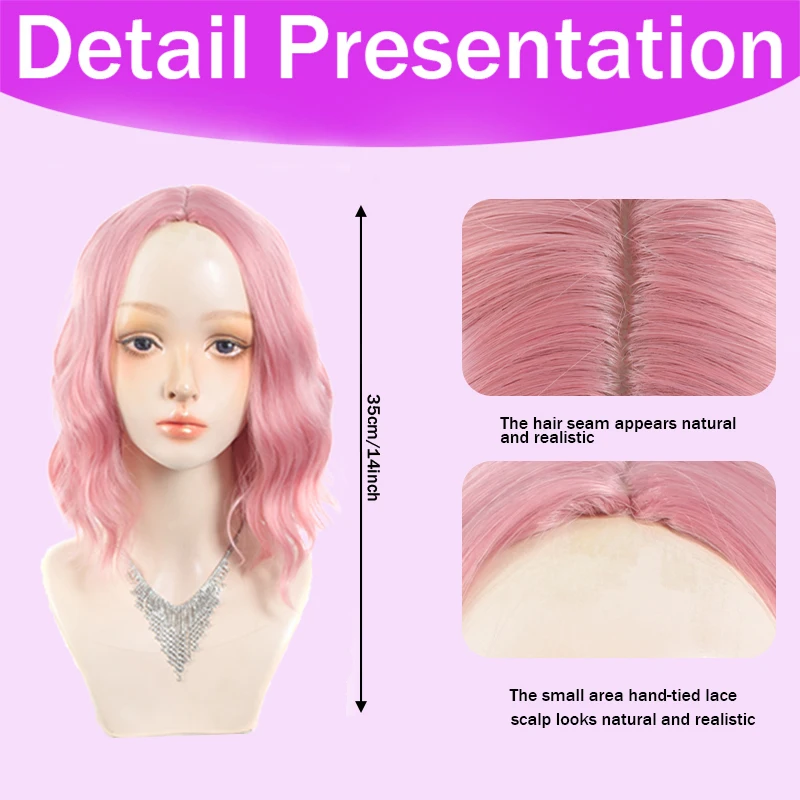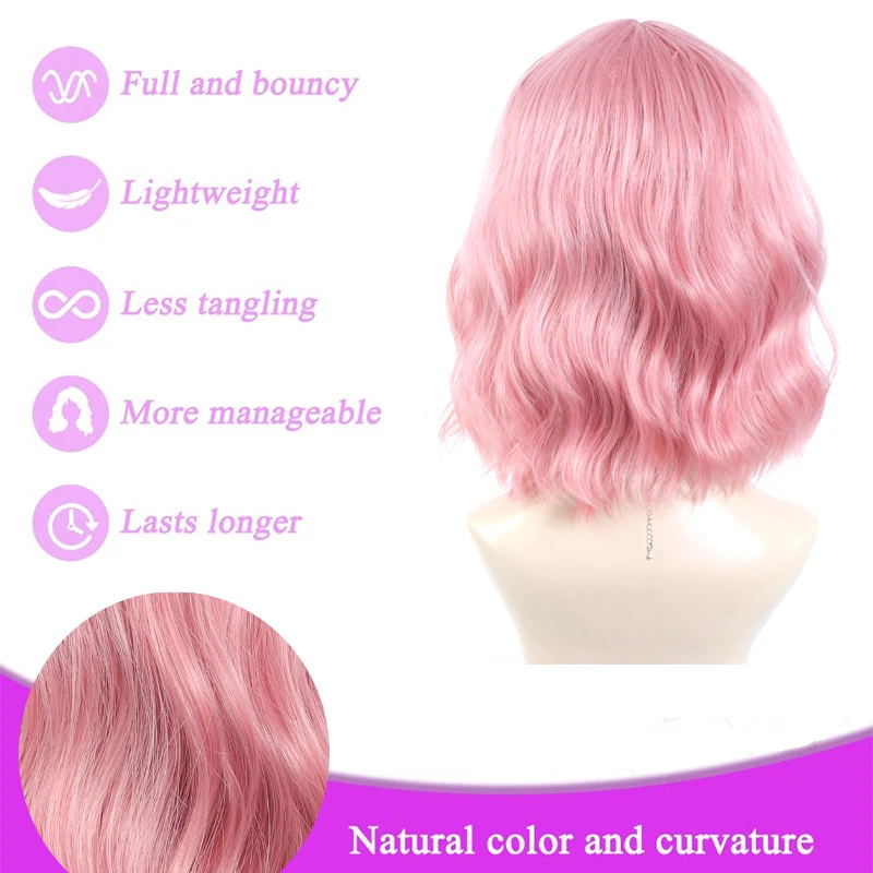 14Inch Pink Wig for Women Short Wavy Pastel Pink Wigs with Lace Shoulder Length Middle Part Curly Wavy  Wig
