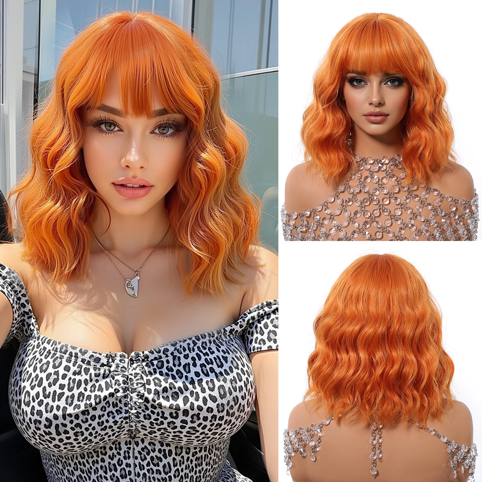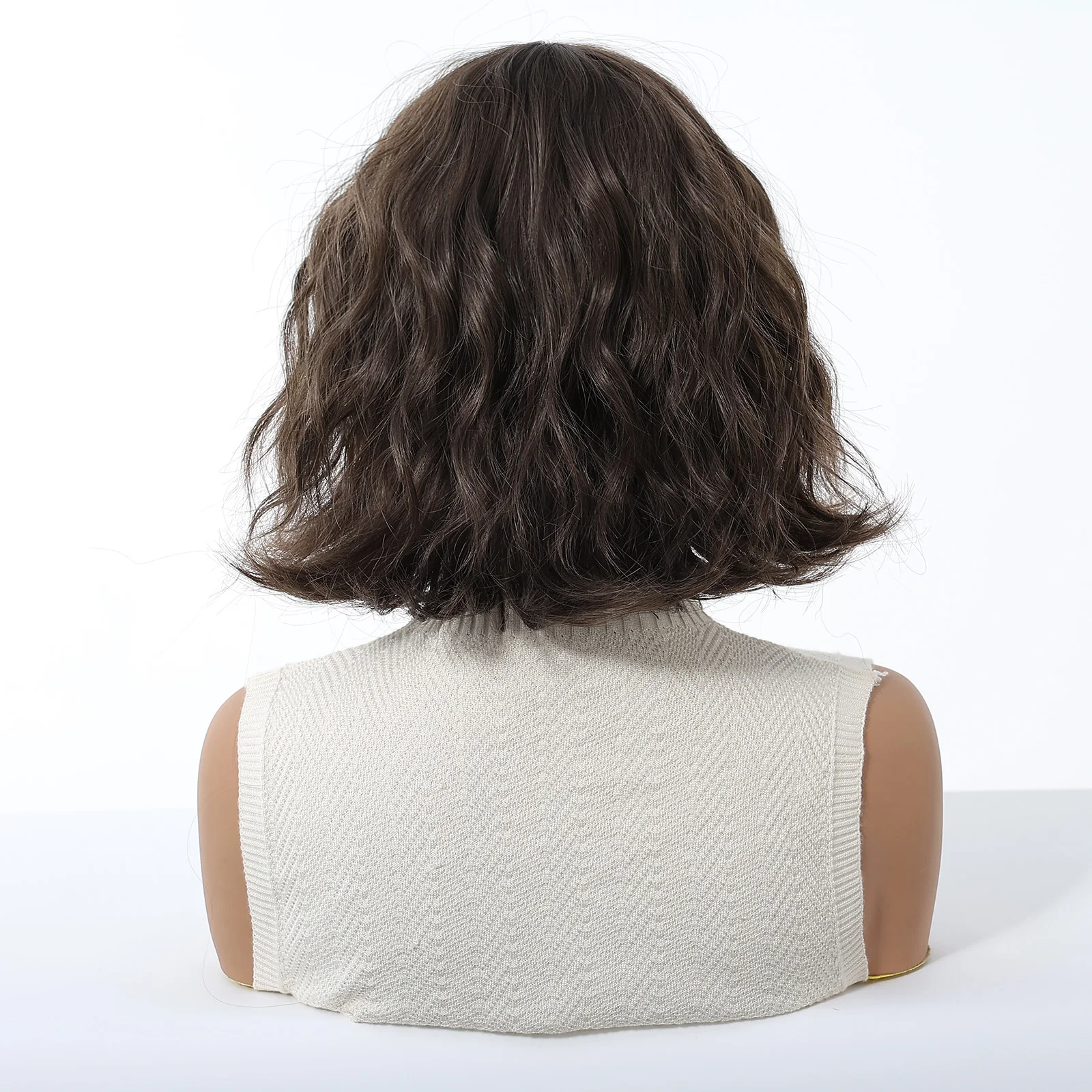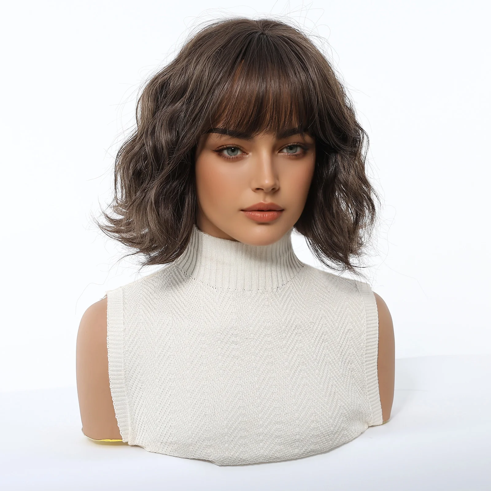 Dark Brown Wavy Bob Synthetic Wigs with Bangs Short  Natural Hair for Women Use Daily Party Cosplay Heat Resistant Fiber