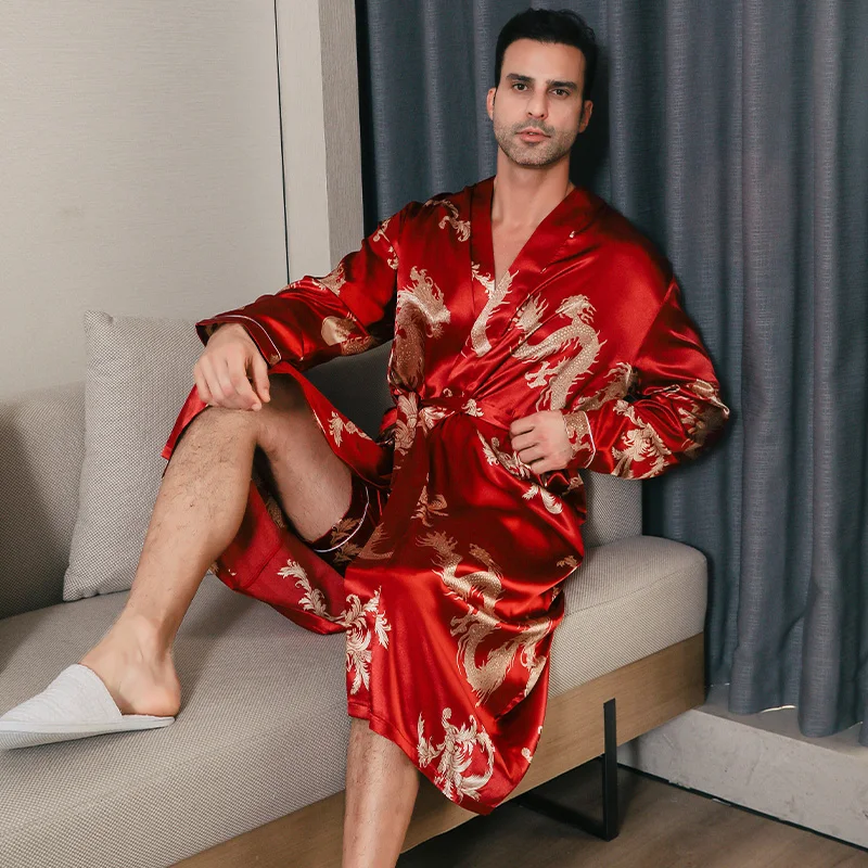 Pajama men's spring and autumn silk thin style oversized pajamas long sleeved bathrobes ice silk bathrobes home clothing summer